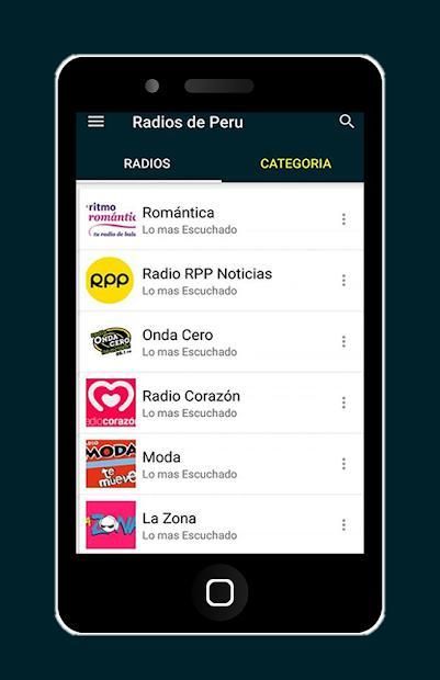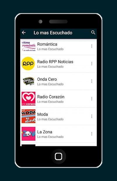 RPP - Radio Programas, Radio Exitosa, Radios la kalle, Radio Corazon, Radio Moda, Radio Oxigeno, Radio La Karibeña, Radio Panamericana, Radio Disney, Radio La Inolvidable, Radio Ritmo Romantica, Radio Magica, Radio Uno, Radio La Zona, Radio Capital, Radio La Kalle, Radio Planeta, Studio 92, Radiomar, Onda Cero, Radio Nueva Q, Z Rock and Pop, Radio Oasis, Radio Ovacion, Radio Felicidad y mucho mas radios que encontrar en la aplicación Radios Peru.