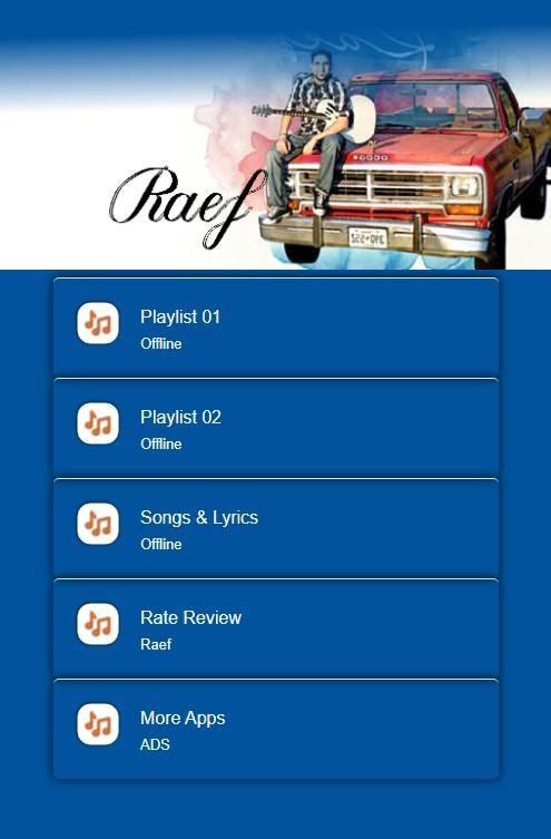 So what are you waiting for downloading the application of Raef songs and enjoy the best songs, it’s selected carefully and also the application is designed to be simple to use and effective at the same time and also a beautiful and comfortable view of the eye. Please enjoy your time with our application. Let’s find the best Raef songs, Raef album and Raef Top's Collection of Songs here: