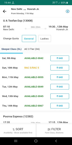 Fare Enquiry : Find fare for all the travel classes like first ac, second ac, third ac, sleeper etc.