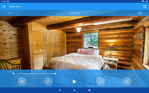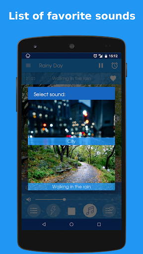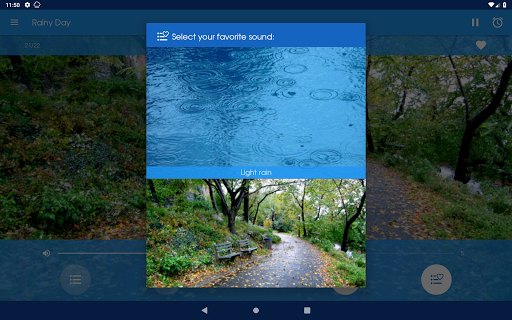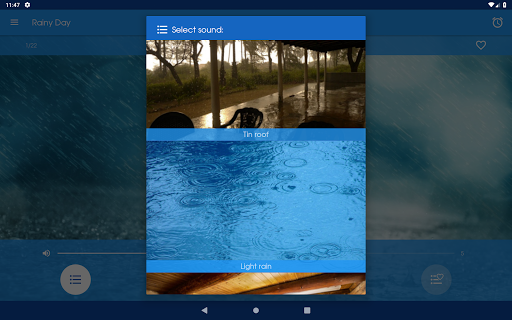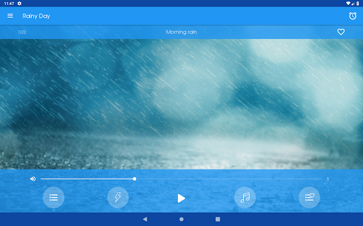 Select a rain sound and, optionally, a thunder and/or a relaxing music. Then you can adjust the volumes individually to find the ideal combination and so encourage a deep relaxation of the mind.