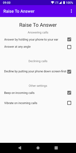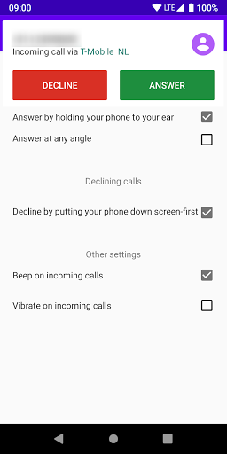 Simply hold your phone to your ear to answer an incoming call. When the app detects the phone is near your ear during an incoming call, it will beep 5 times and then answer the call.