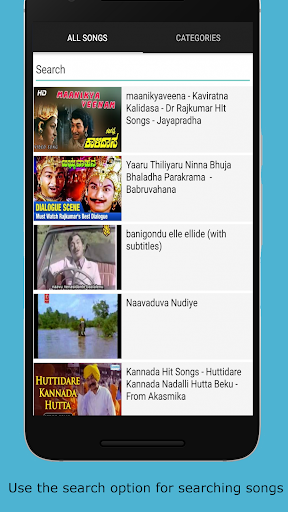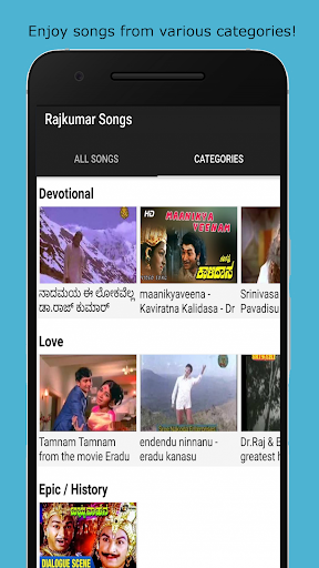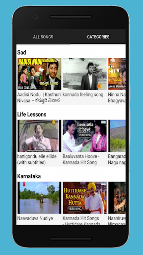 The latest version of the app has an option to group Kannada songs by categories. There is a separate category for Kannada love songs, sad songs, devotional songs, and Karnataka related songs.