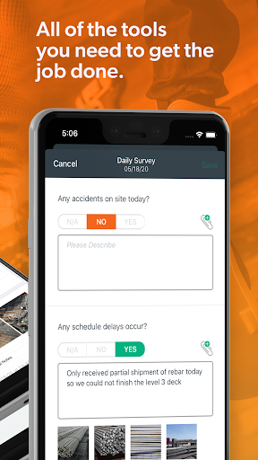 Search a library of safety & toolbox talks to present to the team and capture signatures directly in the app. Create custom checklists for your field teams to complete and automatically send back to the office. Add construction photos, videos and attachments to your report, and at the end of the day, sign and email your daily report right from your phone or tablet!