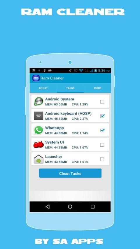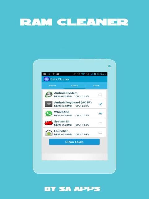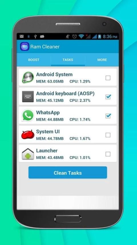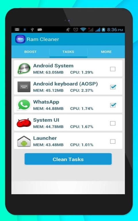 c. Touch Clean Tasks button to remove selected tasks from memory.