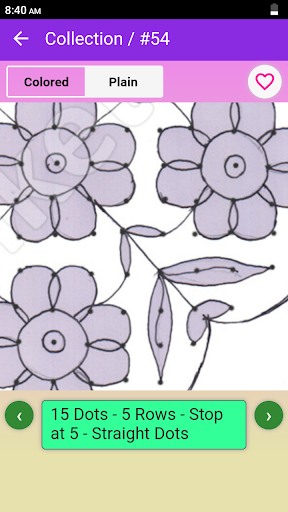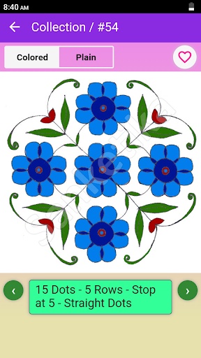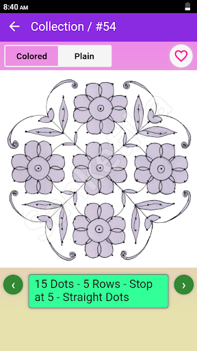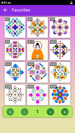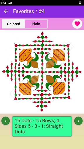 • Favorite Rangoli designs can be chosen which are shown as a separate collection for quick access.