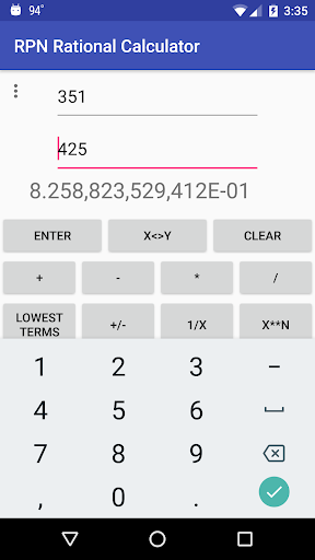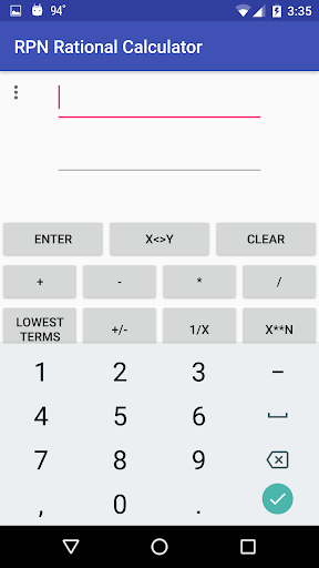 Add, subtract, multiply, divide, convert to lowest terms, minus, reciprocal, or to a power rational numbers with a RPN calculator