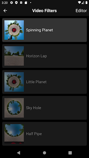 Record a same video sequence from different angles, create a video from a 360 photo, get a selfie video from a 360 video, grab incredible pics with special effects.