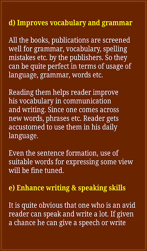 Reading is the basic foundation on which academic skills of individuals are built. As we know the paramount importance of reading, it is given the top priority in primary education. Reading is a great habit that can change human life significantly. It can entertain us, amuse us and enrich us with knowledge and experiences narrated. Improving your reading skills will reduce unnecessary reading time and enable you to read in a more focused and selective manner. You will also be able to increase your levels of understanding and concentration. Many believe that reading is a true measure of a person's success in academics. Most of the subjects taught to us are based on a simple concept – read, understand, analyze, synthesize, and get information. This app shows you how to read with greater efficiency and effectiveness by using a range of different reading skills.