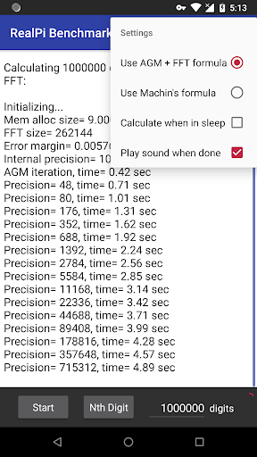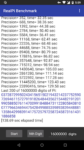 Leave comments with your Pi calculation time on the AGM FFT formula for 1 million digits. Also the most digits you can calculate, which tests your phone's memory. The author's Nexus 6p takes 5.7 sec for 1 million digits. Note that the AGM FFT algorithm works in powers of 2, so calculating 10 million digits takes just as much time and memory as 16 million digits (the internal precision is shown in the output). On multi-core processors RealPi tests the performance of a single core. For accurate benchmark timing ensure that no other applications are running and your phone is not hot enough to throttle the CPU.
