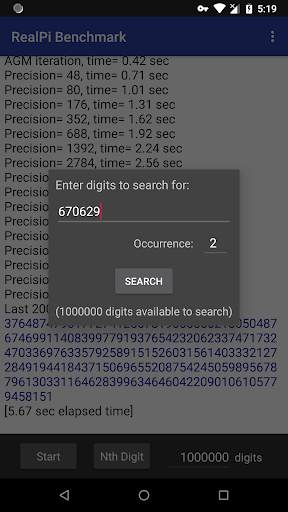 RealPi provides some of the best and most interesting Pi calculation algorithms out there. This app is a benchmark which tests your Android device's CPU and memory performance. It calculates the value of Pi to the number of decimal places you specify. You can view and search for patterns in the resulting digits to find your birthday in Pi or find famous digit sequences like the "Feynman Point" (six 9's in a row at the 762nd digit position). There are no hard limits on the number of digits, if you experience a freeze please see "Warnings" below.