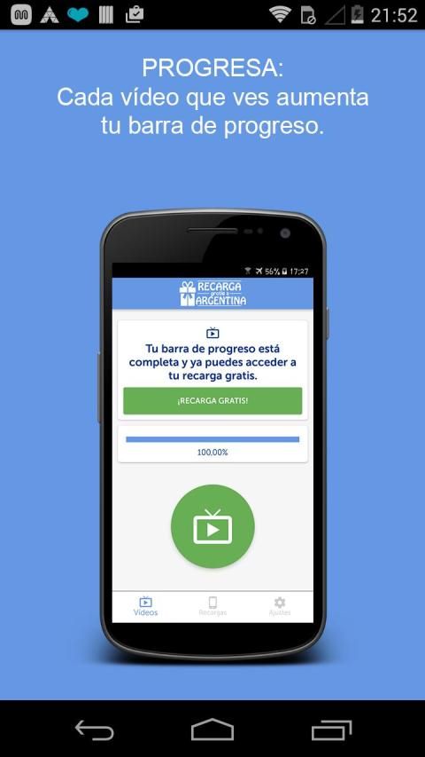 • PROGRESA: Al inicio de la aplicación dispones de una barra de progreso que va del 0 al 100%. Para aumentar el progreso sólo tienes que ver vídeos. Cada vídeo que ves aumenta tu progreso.