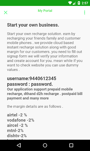 Start your own recharge solution. earn by recharging your friends family and customer mobile phones . we provide cloud based instant recharge solution along with good margin for our customers. you need to fill out signup form we will verify your information and create account for you. mean while if you want to check website you can use dummy values .