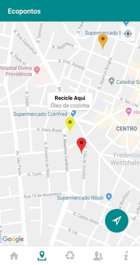 The Recicla Frederico application has the purpose of assisting the inhabitants of the city of Frederico Westphalen / RS to carry out the correct separation of dry and organic residues, as well as informing the local ecopoints scattered throughout the city on a map, with information on which residues discard and with the possibility of tracing a route to get to the ecoponto, another feature of the application is to report garbage collections by neighborhoods in the city of Frederico Westphalen / RS.