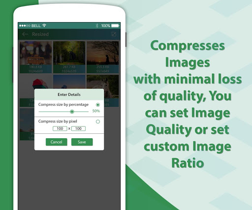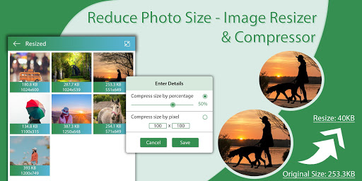 Reduce Photo Size - Image Resizer & Compressor app helps to compress images/photos with minimal compromise of quality. Image compression is minimizing the size in bytes of a graphics file without degrading the quality of the image. The reduction in file size allows more images to be stored in a given amount of disk or memory space. It also reduces the time required for images to be sent over the Internet or downloaded from Web pages.