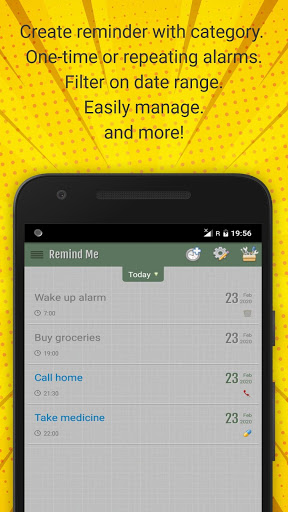 Reminder and alarm app with to-do list functionality. Set one-time or recurring reminders for anything with this app, for ex. pills, workouts, groceries, bills, birthdays, etc. See upcoming reminder at a glance with RemindMe widget. Use quick reminder and tasks feature to increase your productivity. Now, with Remind Me app you can also create voice notes.