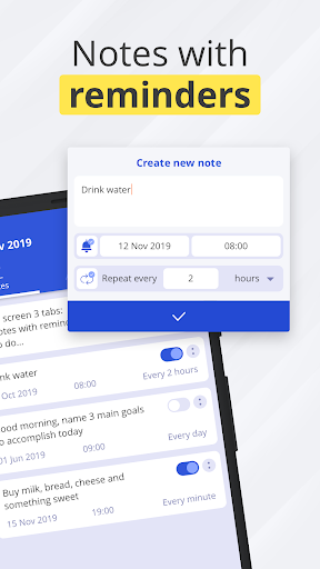 Let's say you want to establish a habit to drink water. 💧 Do you need a separate app for it? Of course, not. You can set a recurring reminder that will remind you to drink water every hour or two. Or you need to do something but you are afraid to forget it even after receiving a notification? You can just set a recurring reminder to repeat you every minute (yes, that often). This will help you to keep the important thoughts in mind!