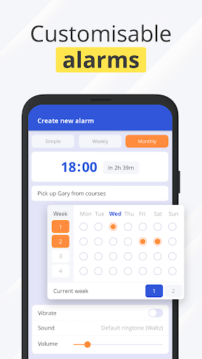 Do you have a complex schedule and tired of setting countless alarms? We added a feature that can simplify your life here. You can set alarm for up to 4 weeks with different days to fire. It can reduce stress and help you to do some important things instead of managing a heap of alarms ⌚
