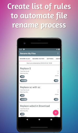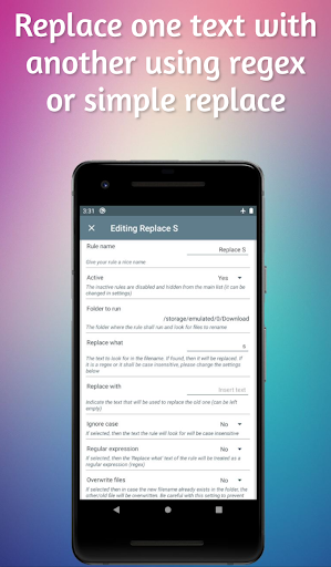 The application allows to create rename rules which can be executed in a specific folder and perform repetitive filename operations on many files