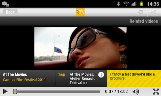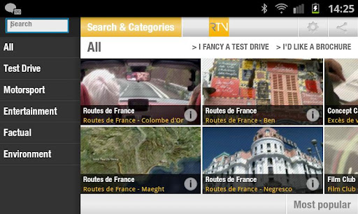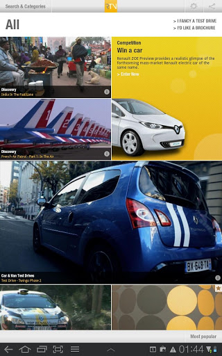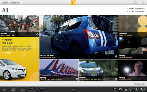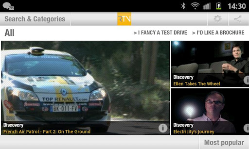 On your phone or tablet.We show proper television, not glorified ads: documentaries and motorsport, travelogues and game shows all hosted by top presenters.Also, we39;re free. Here are three reasons to download our app: Choose from more than 100 hours of ondemand TV Pick from five genres of content and view in pinsharp HD.navigation takes a turn for the better with Drive Mode steer to browseBut the main reason is our shows: they39;re unique to us, made by some of the world39;s finest production companies, and never interrupted by ad breaks. Here39;s the sort of thing you39;ll find in our five genres: Factual: Electricity39;s JourneyRobert Llewellyn of Red Dwarf and Scrap Heap challenge fame traces the history of electricity from 1890 to the present day. Factual: Renault Icons: The Renault 4Featuring a vibrant mix of archive film and interviews this documentary charts the history of Renaults iconic R4 Entertainment: The KeyTorchwood star and standup comedian Tom Price takes a literal approach to incar entertainment: a quiz show from the Tardislike back seat of an Espace.Entertainment: Happy CampersGMTV39;s Kirsten O39;Brien takes a gadgetloving family into the wild: will they turn feral and renounce civilisation, or will they try to browse a squirrel?Motorsport: The Engine WhisperersF1 drivers wouldn39;t get far without their mechanics. Unless they can jog at 200mph. We meet the gifted grease monkeys behind the reigning champs.Motorsport: World Series by RenaultWatch the highlights of every rally of the season from the prestigious WSR competitions, including the Eurocup Formula Renault 2.0 and the Eurocup Mgane Trophy.Environment: Ellen Takes the WheelDame Ellen MacArthur saves the planet instead of circumnavigating it: we join the sailor of the century for a day39;s test drive in an electric car. Environment: Five Days to Change the WorldHosted by chef and green guru Jeff Strawbridge from ITV39;s The Hungry Sailors. Can a family reduce its carbon footprint to antlike dimensions? Test Drive: Fluence Z.E.Get the inside track on Renaults revolutionary new Zero Emissions allelectric family saloon car and how you can use your smartphone to monitor its performanceTest Drive: ClioWe put Renault39;s classic city car through its paces to discover exactly how much va va voom it really has and just what has been making Thierry so excited all this time.