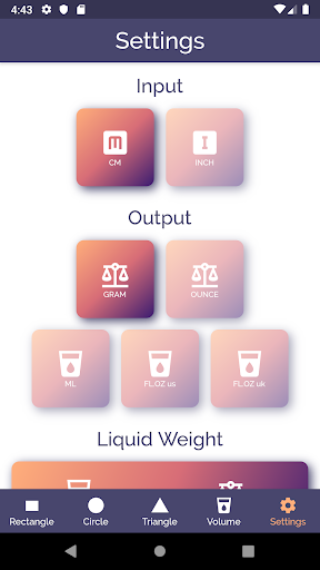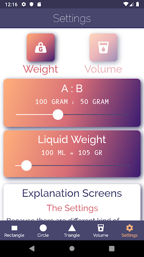 First you indicate whether you work with volume or with weight. If you click on the volume button, the screen showing how many grams of 100 ml epoxy weighs, disappears.