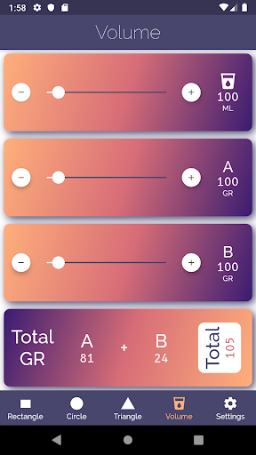 Slider one: You enter here the number of ml that you want to make in total. The result is the mixing ratio of A and B to get that volume, depending on your preference in ML or in GR.