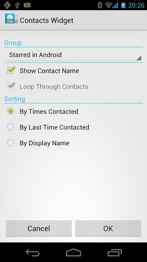 Put your favourite contacts on your home screen with quick actionsPut your favourite contacts on your home screen with quick actions, including directly making a phone callNoteI have lost my release keystore, and can NOT make any further release. For the latest version please check my project site: http:goo.gl9O0wD.For those of you who are complaining about the low resolutions, this widget will never try to download the contact photos for you and directly get photos from the system contacts database If you have a low resolution pictures in your People app, then there is no chance this widget would find any higher resolution copy for you.Major Features: Add a list of contacts on your home screen The list of contacts could be either starred contacts or from any of your contact group Resizable with default size to be 1 1. Sort your contacts by Times Contacted, the most frequently contacted appear at the top Last Time Contacted, the most recently contacted appear at the top Display Name A new stack view based wigetfixed size 22 can show your contacts with larger imagesThis is an open sourced Android widget built for Android 3.2 devices. It allows users to quickly view your favouritestarred contacts or any groups via a resizablescrollable contacts grid.NOTEs, if you encounter any issue please uninstall your currently installed app and then reinstall from the MarketCurrent limitations: If you have multiple Google accounts synchronized to your device, the contact groups selection list would not distinguish where the group comes from Holo theme not working well for pre 4.0 devices, so the configuration window might not look good.Tested Devices: Samsung Galaxy Nexus, Samsung Galaxy Tab 7.7