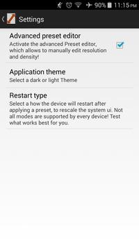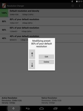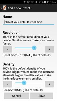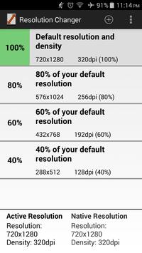 This app makes it easy to change the resolution of your screen in order to play games with more FPS, save the battery or to test your app with different resolution.