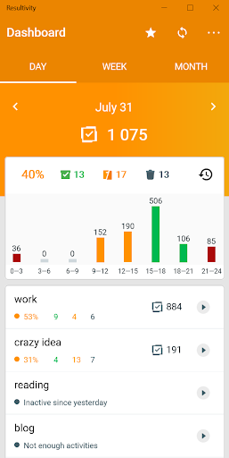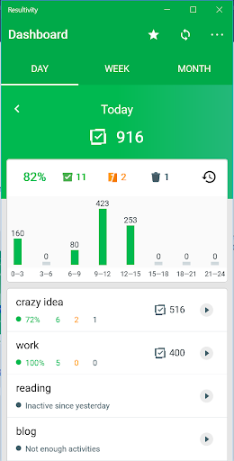 Points system provides a convenient reference point throughout the day. Like in fitness, you can simply look at the number of steps per day - 10k or more – boom, it’s a great day, a small victory. In the same way, in Resultivity – if you score 1000 points per day – it is a productive day! Just a few of these days per week guarantees hitting your productivity goals for a whole week.