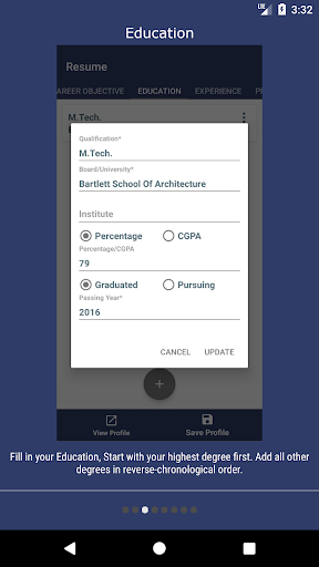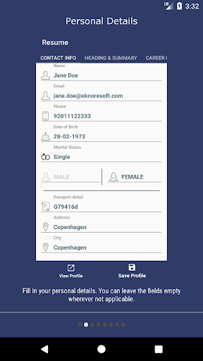 Now you can instantly creates simple and professional resume for your interview on the go using this app.You can save your all the details for the further use so you don't have to enter the details every time. You can also create multiple resume if you want to create different kinds of resume or CV for different person.So start making Cv for job application and good luck.