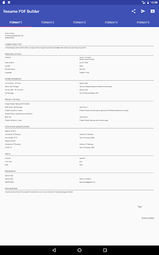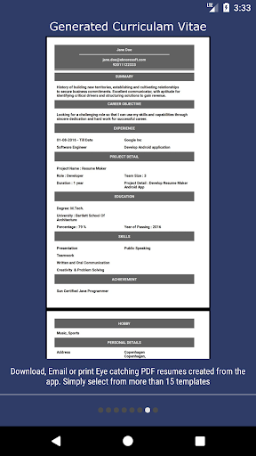 Resume or CV is first impression during job hunting. Resume PDF Maker app will help you to create, make, edit, share professional format resumes in PDF format quickly. Professional looking resume is a must have when you apply for any job, going for an interview, job hunting, job search, applying for jobs on job site etc.