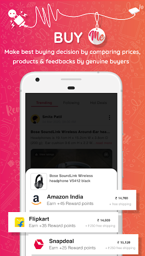 The only app where shoppers can share, discover and experience genuine reviews and opinions about trending products with their friends and family. Find lowest price for Mobiles, Earphones, TV, Speakers, Appliances, etc. across brands like Apple, Samsung, Dell, HP, Asus, Sony, Bose, Oneplus, Xiaomi, Realme, etc. EARN rewards on each genuine review and purchase.