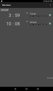 Ride Alarm is an alarm clock that will predict and adjust for traffic. Ride Alarm will alert you sooner if traffic is bad or even delay your alarm if traffic is lighter. With the "Travel Alarm" option two alarms will go off. The first one will notify you when to get ready and the second one will notify you that you should leave soon to get to your destination on time. Both alarms will periodically check the traffic and make adjustments. Ride Alarm was intended to be a "wake-up" alarm but it is also great anytime you need to travel such as driving to appointments. The "Simple Alarm" option is a normal alarm that will go off at the scheduled time.