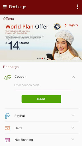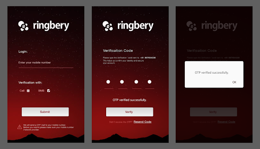 Ringbery mobile app used for making VoIP (voice over internet protocol) calls, users can signup to Ringbery app by an OTP received to their registering mobile number. By signup user will get free credit to test the service. Users can make free app to app calling, purchase international virtual numbers (DID Numbers) from Ringbery VoIP app.