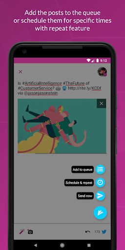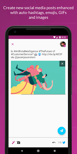 Schedule remarkable posts with auto-hashtags, emojis, GIFs and ads on links.