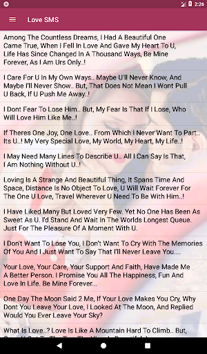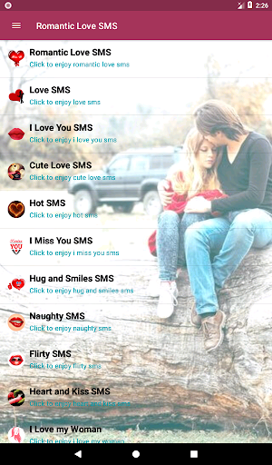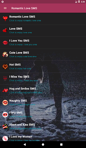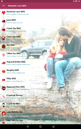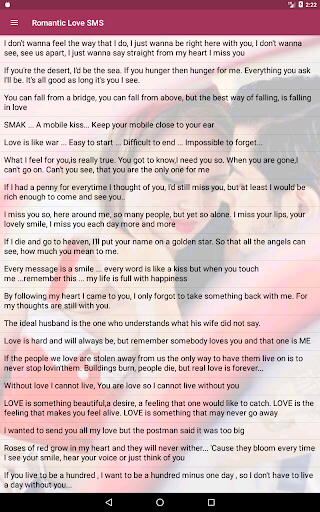 This application contains thousands of romantic love messages and love sms. This pool of amazing romantic love messages and SMSes gives you a wide variety of content to choose from. Feel free to scroll through the first list of categories and choose what best befits your target recipient at that specific time. Say 'I love you' in thousands of ways.