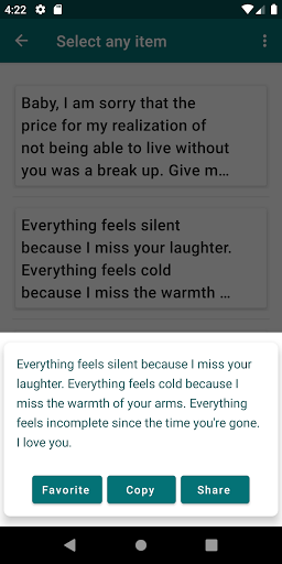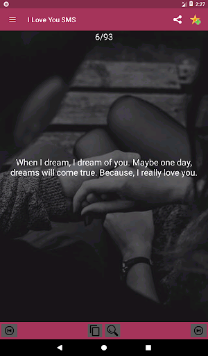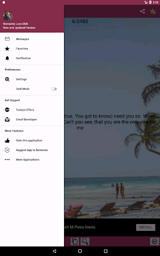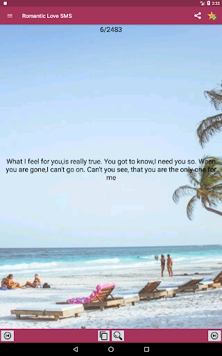 Share romantic messages by clicking the share icon. It is that simple. If you are on the favorites section, simply click on the SMS you want to favorite and click the share button. (You can share several quotes while at the favorite section).
