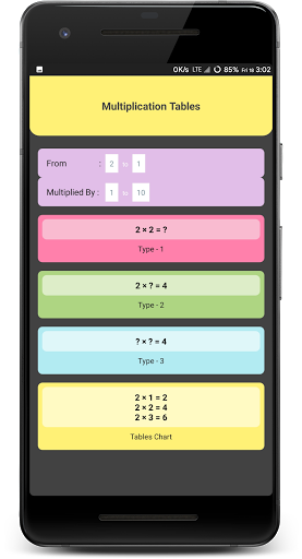 *Added Multiplication Tables, Square n Cubes Chart. Now you can input a range and view a beautiful chart for learning before practicing