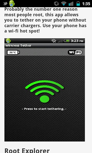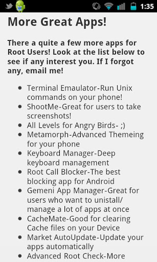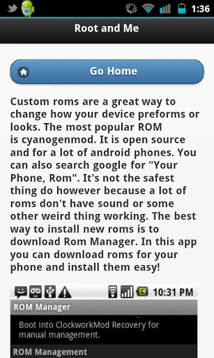 Learn how to root your phone4.1App is rewritten with Android 4.1 SDK and Cordova 2 1 0 I have also tweaked other performance issues. It still may take up to ten seconds to load but it won39;t get an HTML error. Black Screen? Give the app a minute load See note at bottom. Load can take up to 1 minute on 3G Try WiFi.. UPDATE SOONRoot and Me is a great app for any user looking to root their device and what they can do afterwards This is the best app for new users who are looking for some information and straight forward guides There are guides to root most popular phones If the phone isn39;t listed, there are great instructions in the app for finding a guideWhat will be included in this app?ProCons of rootingCommon root termsRoot Defined in depthRoot Only AppsBackup GuidesCustom ROMS GuidesThis app is tested to work on most Android phones and Tablets Root is not required for this app An internet connection is not required for this app, but is to load images.This app has been tested to work in a wide variety of devices and screen sizes. If you get the Black Screen connect to the Internet and give the app up to a minute to load If you get errors please send me information. I have tested this app personally on tons of devices and it works every time.