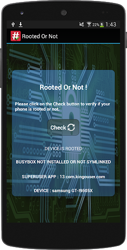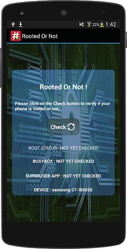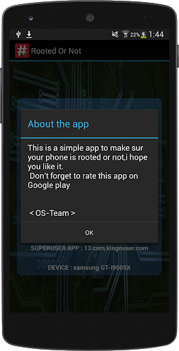 This is a simple app to make sur your android device is rooted or not,By simply one clickon the check button ,i hope you like it. Don't forget to rate this app on Google play Os-Team