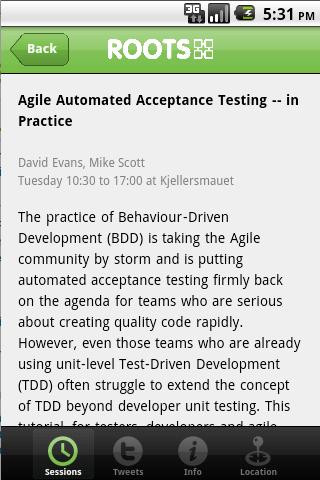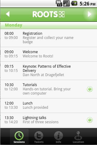 The Roots 2011 application is hereThis is the official app for the Roots conference held in Bergen, Norway. The Roots conference is Norway39;s oldest IT conference, and will take place May 23.25.The Roots 2011 application provides attendees with a full overview of the conference schedule day by day. You39;ll find details about time, location, speakers and abstracts for all of the sessions. You can also keep uptodate with the latest tweets for the conference.program overview Session details Twitter feed for roots2011 Practical information and city map.Grab the Roots 2011 application today to ensure you39;ve got all the conference information onhand for the event