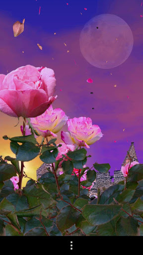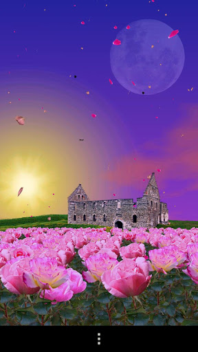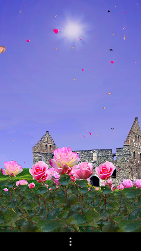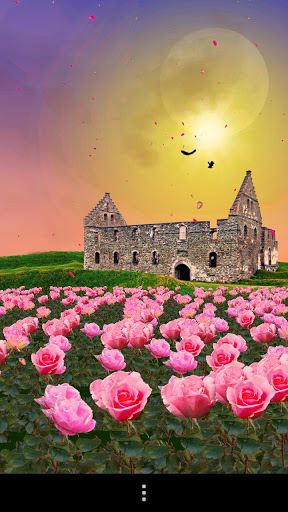 Pink roses in front of a castle ruin. Live sky with sun, moon, clouds, birds and falling rose petals.
