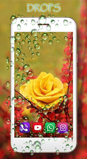 The application Roses Autumn Live Wallpaper realizes the realistic effect of water droplets on the glass. Drops of water on the phone's glass are scattered in a random order. At the touch of a drop, the dew changes the trajectory of motion.