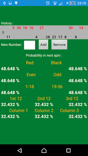 Roulette Calculator calculates probability of the next spin in Roulette. So it is a kind off roulette prediction (not roulette cheating). And you do not need to remember if you have long series of Color, Pair, Column, Twelve or Eighteen.