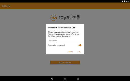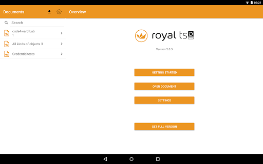 Royal TSD Lite provides easy and secure access to your remote systems (RDP, VNC, SSH, etc.) by allowing you to open your Royal TS/X documents created with Royal TS (for Windows) or Royal TSX (for macOS).