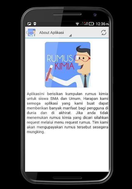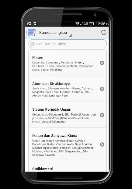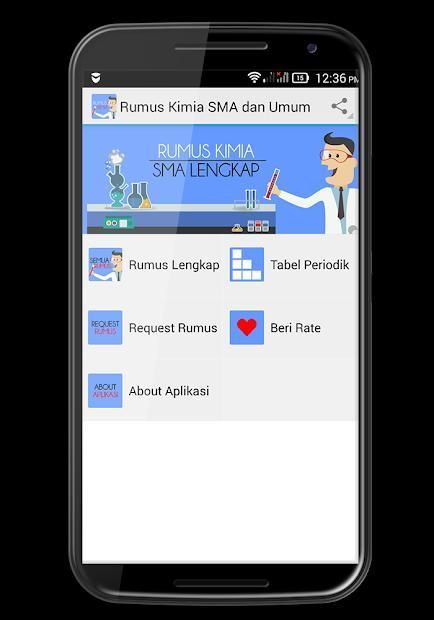 Aplikasi rumus kimia SMA merupakan aplikasi belajar kimia yang menyediakan rangkuman lengkap rumus-rumus kimia di tingkat Sekolah Menengah Atas. Ada puluhan rangkuman materi kimia yang ringkas dan mudah dipahami. Berikut beberapa materi dan rumusnya yang ada di dalam aplikasi ini: