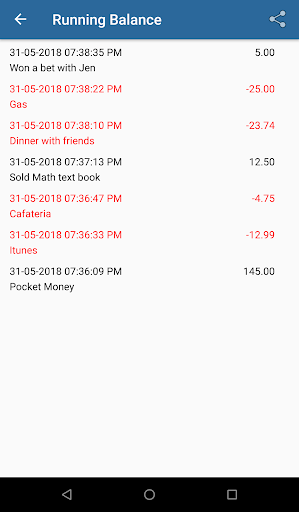 All transactions you enter are kept in history and you have an option to share it with others. This is especially useful if you are tracking a social account and you need to provide updates to your friends or colleagues at work.