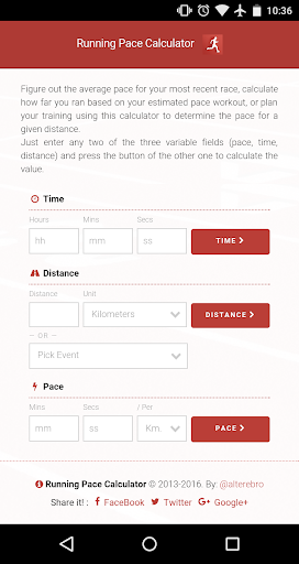 Just enter any two of the three variable fields (pace, time, distance) and press the button of the other one to calculate the value.