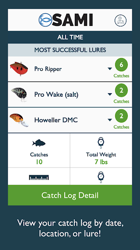 SAMI is the most comprehensive fishing app for creating everything you need to plan a trip ahead of time or adjust your plan during the day. Every time you hit the catch button you create a history of your fishing activity to find your best lure, best time of day to fish and best location.