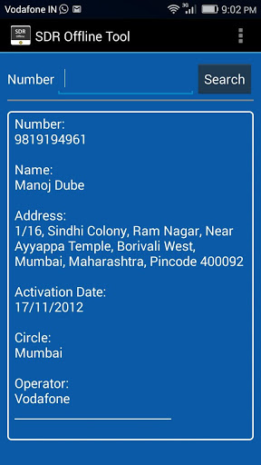 It displays the Name, Address, Activation Date, Current Circle & Operator of a Mobile Number.