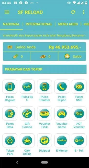 The SF RELOAD android app is a free mobile application for SF RELOAD loyal members wherever they are. This application makes it easy for you to perform various transactions such as topping up pulses, purchasing electricity tokens, paying postpaid bills, purchasing game vouchers, etc.